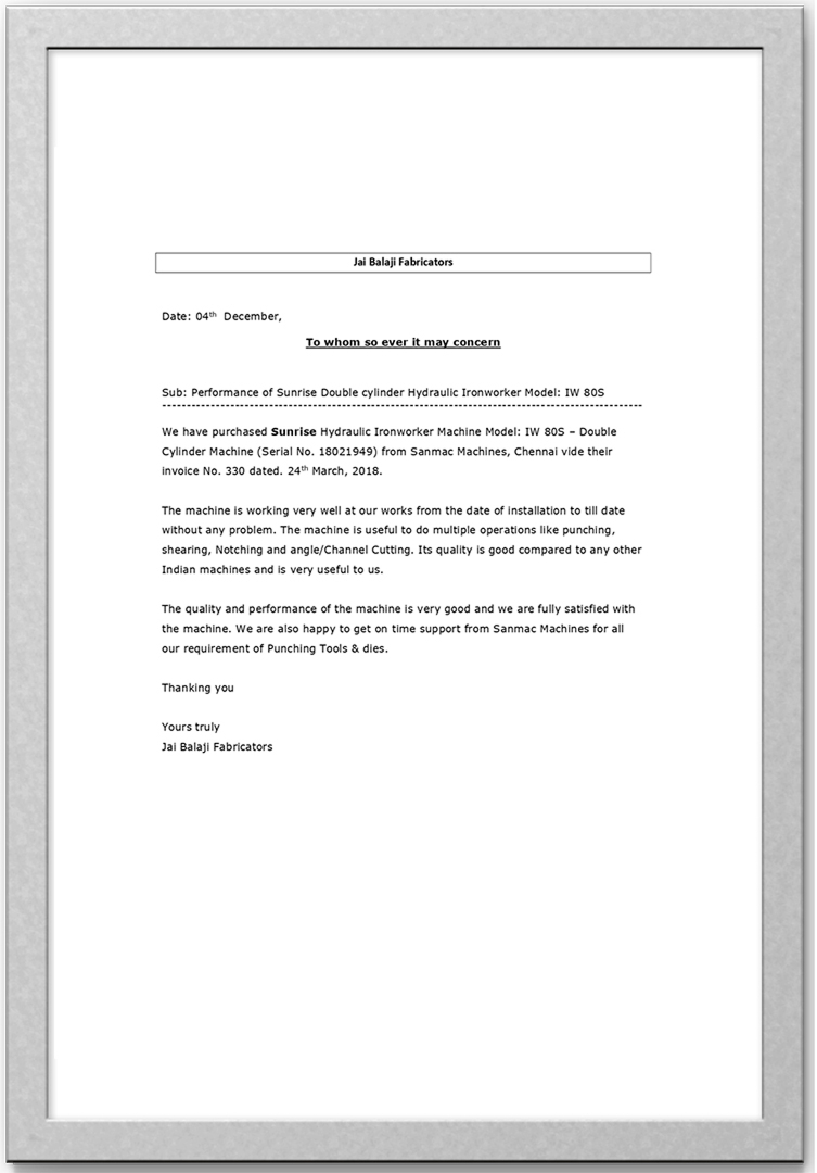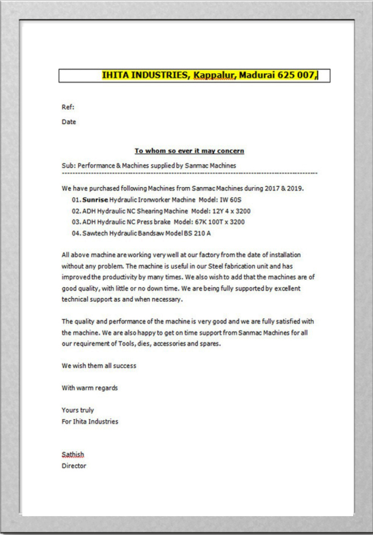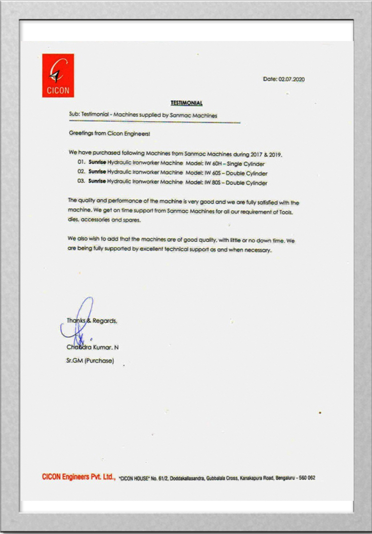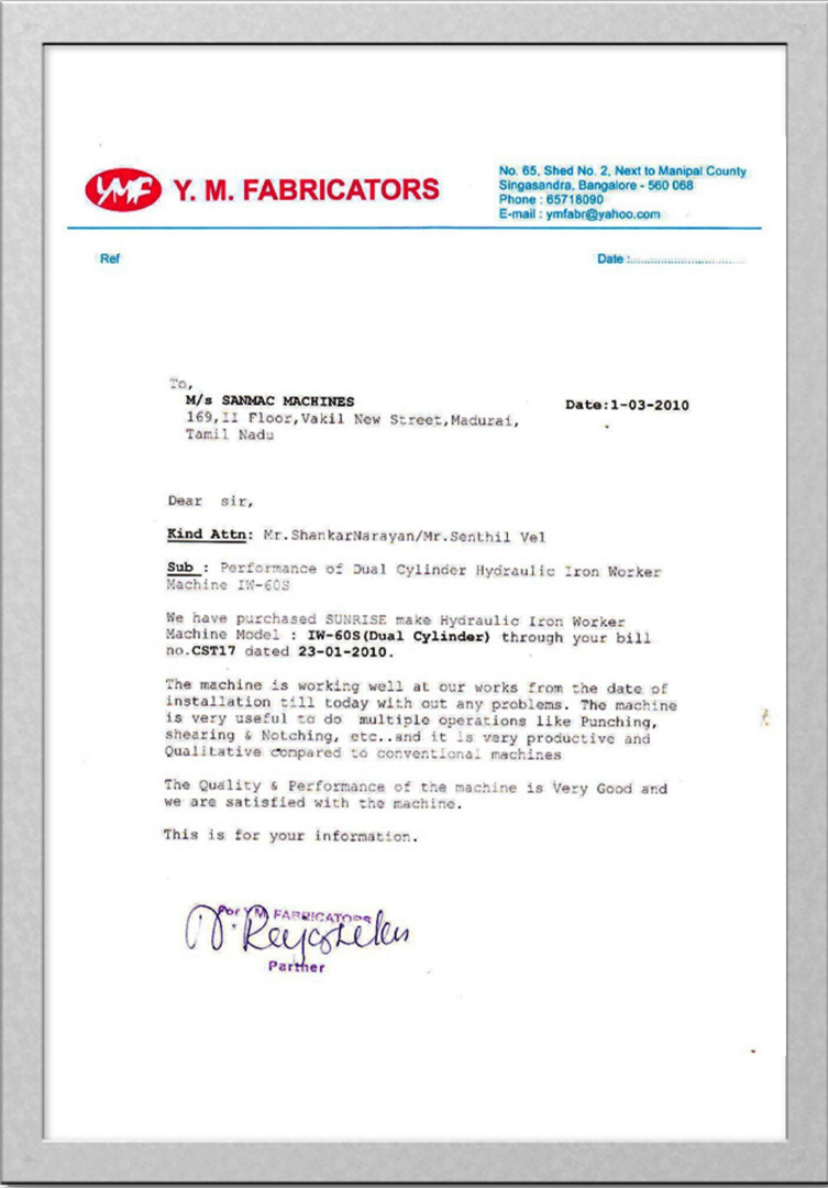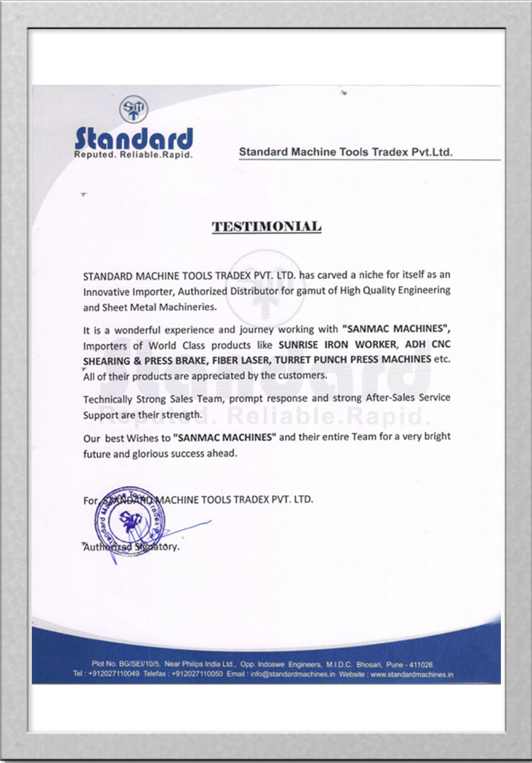 "It is a wonderful experience and journey working with “SANMAC MACHINES”, Importers of World Class products like SUNRISE IRON WORKER, ADH CNC SHEARING & PRESS BRAKE, FIBER LASER, TURRET PUNCH PRESS MACHINES etc. All of their products are appreciated by the customers."