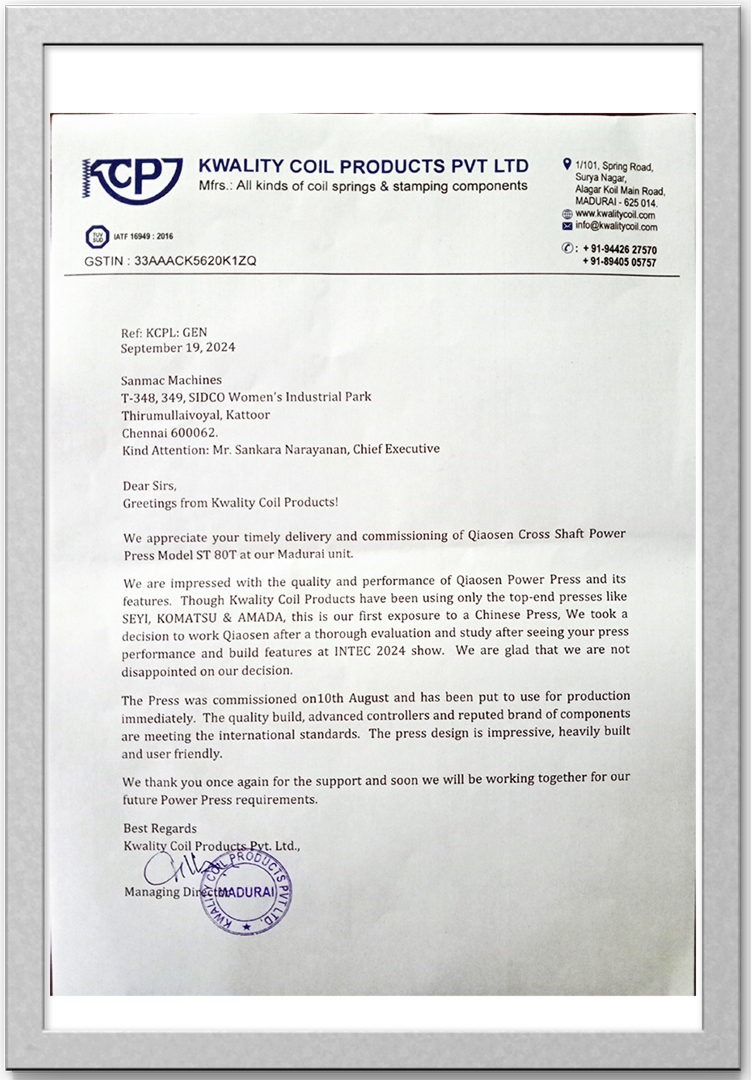 "We are impressed with the quality and performance of Qiaosen Power Press and its features. Though Kwality Coil Products have been using only the top-end presses like SEYI, KOMATSU & AMADA, this is our first exposure to a Chinese Press. We took a decision to work Qiaosen after a thorough evaluation and study after seeing your press performance and build features at INTEC 2024 show. We are glad that we are not disappointed on our decision."
